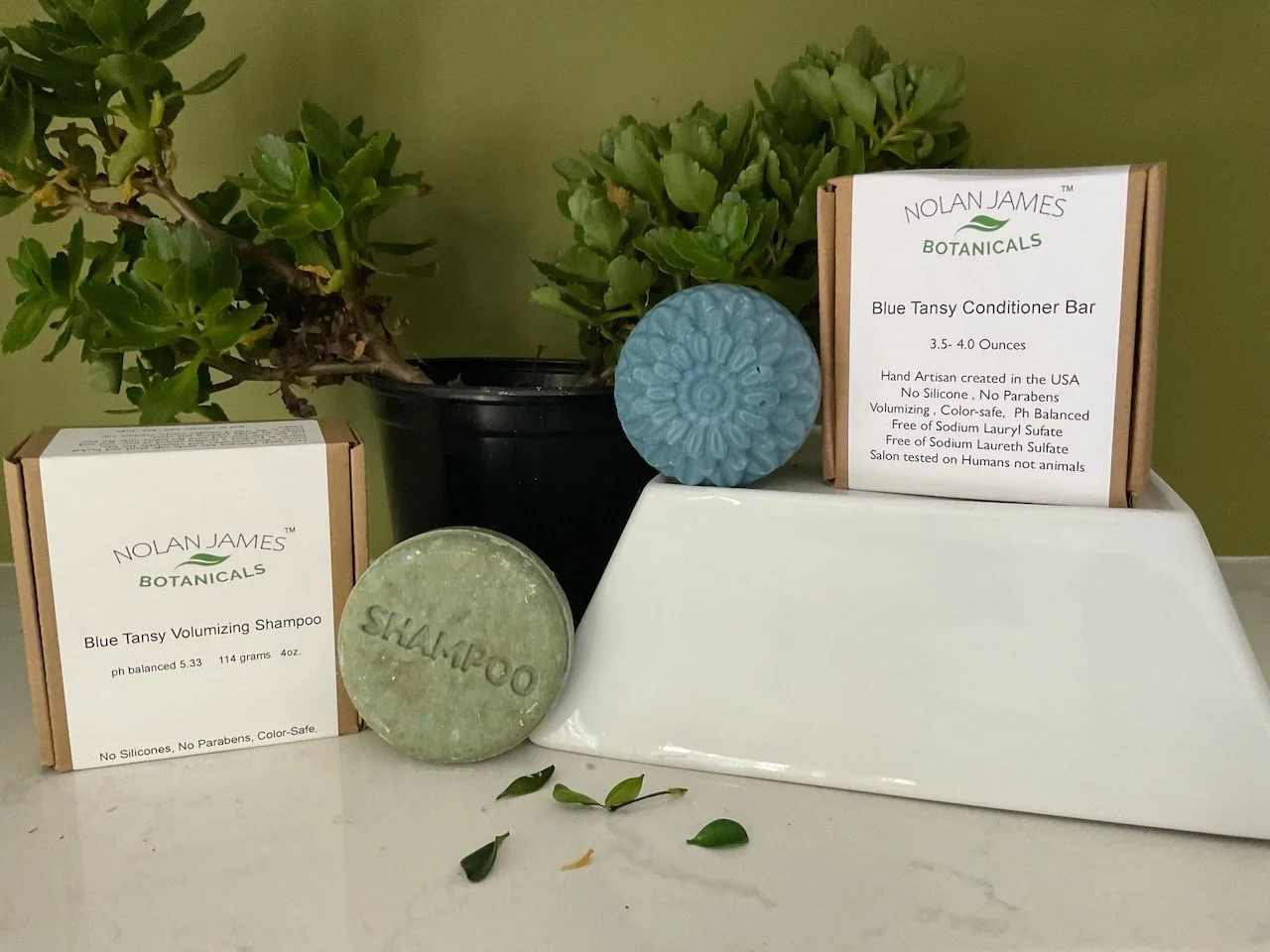 Nolan James Botanicals shampoo and conditioner bars with packaging displayed on a white surface. Green leaves in the background.