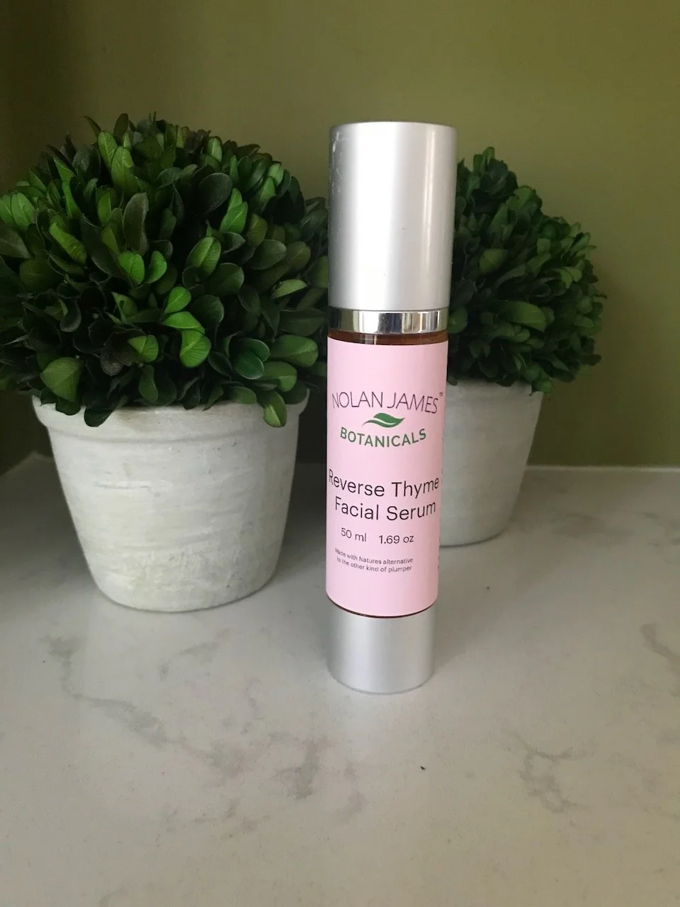 Nolan James Botanicals Reverse Thyme Facial Serum bottle on a marble surface with potted plants in the background.